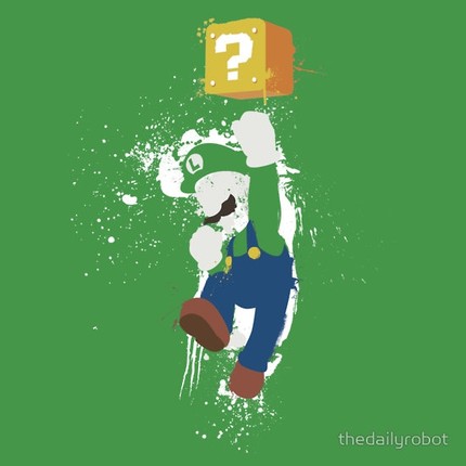 Mario’s taller, younger brother leaps for a ? block in this splattery shirt (the second in a series, “Mario Paint.” Side effects of the shirt include: jumping higher and reduced traction when walking and running.