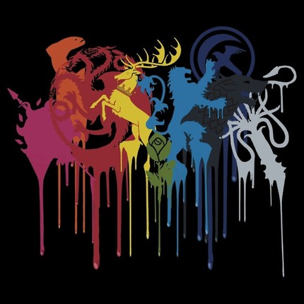 A spectrum of color featuring the sigils of the nine Great Houses of Westeros: Martell, Tully, Targaryen, Baratheon, Tyrell, Lannister, Arryn, Stark, and Greyjoy.