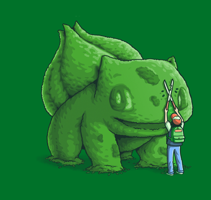 Ash couldn’t bring himself to capture any more monsters in that tiny prison of a ball, so he turned his efforts to art instead. He found that shaping topiaries into pleasing monster shapes helped soothe his mind, and it was almost the same as actually catching a pocket monster because the captive plant was trapped in his yard with nowhere to go. Ash kept adding plant type monsters to his topiary collection, and when he had enough he began to envision his yard as a battle arena, with plant monsters battling it out for a drink of water.