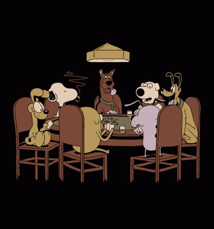 A cartoon version of "Dogs Playing Poker" featuring Odie (Garfield), Snoopy, Scoobie, Brian (Family Guy), Pluto, Courage the Cowardly and Jake (Adventure Time)