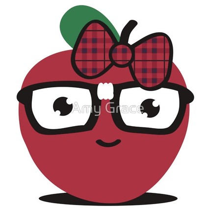 Cute cartoon featuring an apple in glasses, wearing a plaid bow.