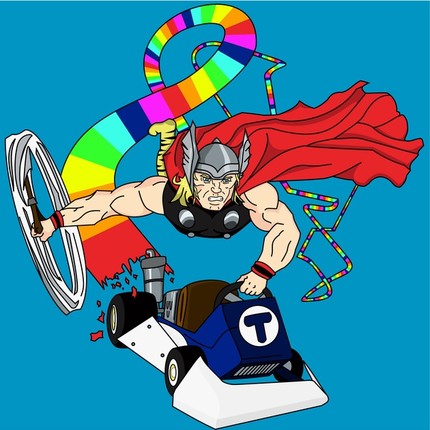 A Thor and Mario Kart mashup. When Thor's not busy saving the world and being an Avenger he spends some of his free time karting around on rainbow bridge. Unbeknownst to most rainbow bridge is actually quite long... its more of a "rainbow road".
