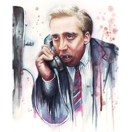Watercolor painting of Nic Cage as a vampire in a scene from "A Vampire's Kiss"