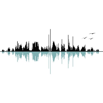 City silhouette reflected in water creating a music or sound graphic.