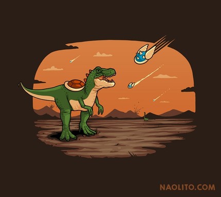 This is how the dinosaurs became extinct. A lot of Blue Shells fell from the sky, devastating all of them. Poor Yoshi...
