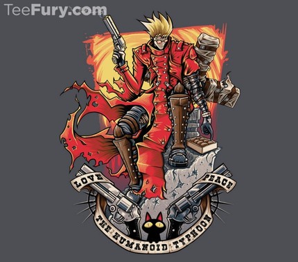 It's not every day you get to see a shirt design based on the world's most wanted man, Vash the Stampede! Love and peace!