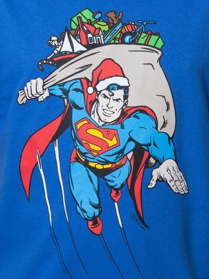 It's a bird, it's a plane, it's Super Claus! This Superman shirt shows the Man of Steel taking on the role of Santa and delivering presents to all the good boys and girls.