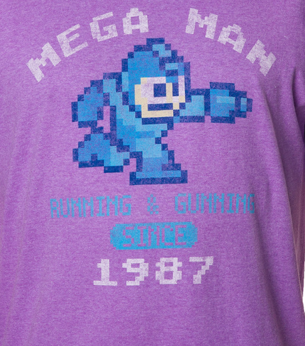 Luckily, you don't need a Mega Buster to show your love for Mega Man. All you need is this purple 1987 Mega Man t-shirt.