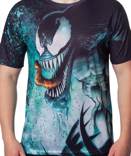 This sublimation shirt features a gruesome image of Venom, the alien Symbiote made popular in Spider-Man comics.