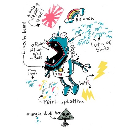 Is this the perfect tee? The Perfect Tee is a cartoon style showing a robot, a triangle skull, a Japanese sunrise flag, a rainbow, birds and lightning bolts. This designer shirt has everything you could want on a shirt.