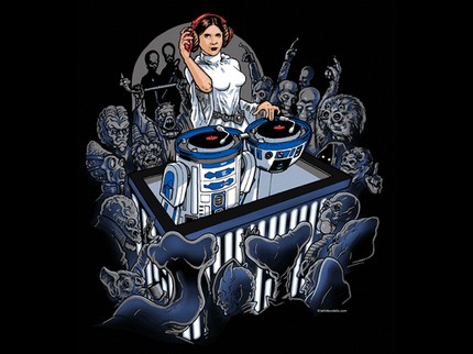 DJ Leia and R2 live at the Moss Eisley Cantina, spinning her new sonic disk "Kessel and Back." You'll find this DJ Leia shirt and other cool stuff in the back of the cantina after the show.