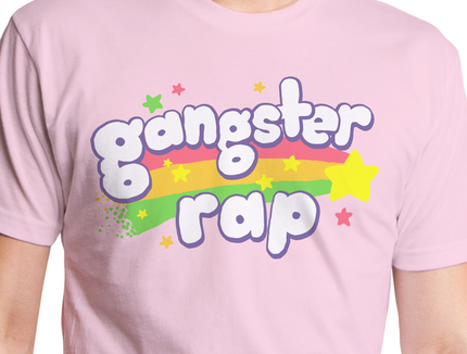 Bright pink tee displays colorful words "Gangster Rap".