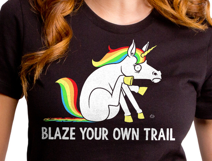 Shirt displays Unicorn leaving a trail of rainbows behind him with words: Blaze Your Own Trail.