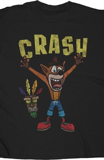 Aku Aku, the wooded mask that guides Crash also appears on the shirt.Since his debut in 1996, Crash Bandicoot has consistently remained one of the most popular video game characters of all time.