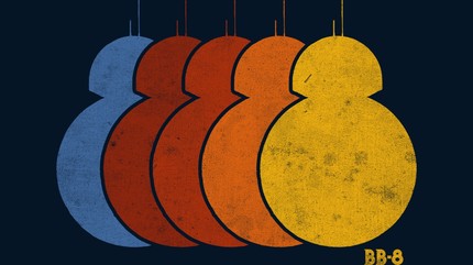 BB-8 is outlined in five colors of the rainbow in this vintage, distressed Star Wars Episode VII t-shirt.