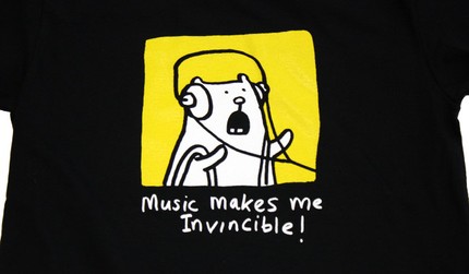 Hey, it's this classic shirt, digitally remastered, from Kelly Vivanco's comic Patches! It says "Music Makes Me Invincible" on it and there is like a rodent wearing headphones. It's the best shirt you'll ever own. You will ask to be buried in it but your kids will insist on you wearing a suit. Like it matters.