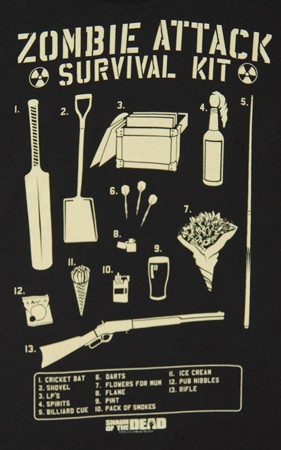This Shaun of the Dead shirt features some tools of survival when surrounded by the living dead.