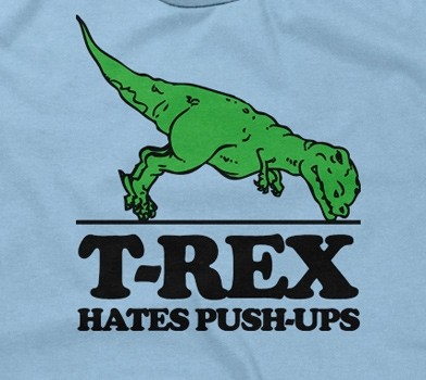 If there's one thing a T-Rex hates, it's getting owned by a pushup! His little arms make it impossible to win any contests...poor T-Rex! Show a little love to the big guy in this soft heather gray tee screen printed in black ink!