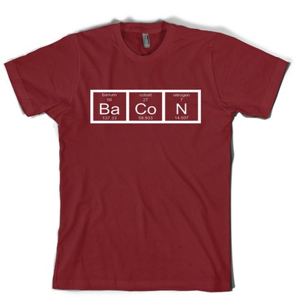 Do you know the right combination to get your daily dose of bacon? Scientists agree it can really help boost your metabolism! Over one hundred elements, and this combination of 3 this is our favorite, not to mention tastiest! This Bacon Tshirt is printed on a soft maroon tee with white lettering, starting your morning off right!