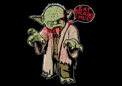 "Brains...Eat yours I will." This is not something you want to hear when your ship crash lands in the swamps of Dagobah. Alas, it's true, as Yoda has risen from the dead and has a hungry look in his eye. He makes for one smart zombie that will use the power of the Force to track you down. Use the brains you still have to grab this Yoda tshirt and warn others of impending zombie doom.
