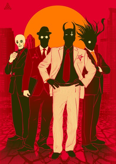 They are here to collect any outstanding debts. Buckle up and go on a ride with the Agents of the Apocalypse. They're like the superheroes for the man downstairs. Rock out with this cool illustration, bright art and awesome modern twist on an old image. This art could be a gig poster for a death metal band or it could be on your chest.