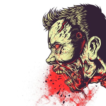 Zombie Frenzy, the ultimate zombie tee. This is a HUGE print stretching right across the tee. Zombie spits blood and you will too if you miss out on this awesome graphic tee. Amazing line work and cool colors this zombie T-shirt will scare the eep out of all that see it. The apocalypse is here, enjoy!