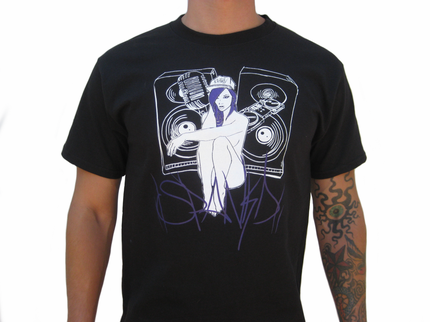 Musically themed sketch style purple haired DJ girl with turntables, speakers, and an old school microphone