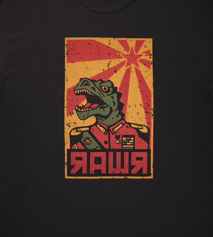 Political power grows out of the tiny arms of a t-rex. Orange, red and green ink on a black tee.