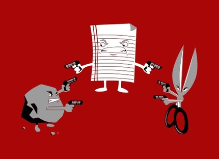 Each guy has one gun full of blanks, and they don't know which one.