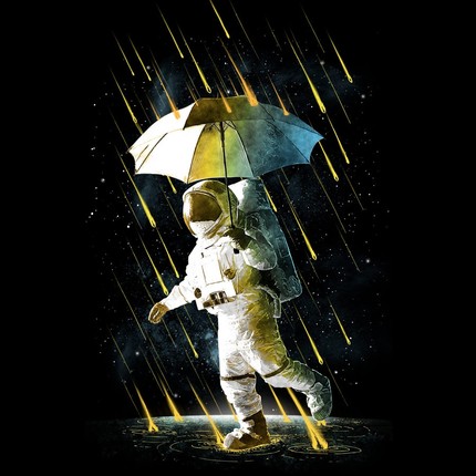 Meteor Showers in Space! This cool space themed tee depicts a spaceman protecting himself from the on coming meteor shower. A fun play on words and a cool graphic tee this one will have you singing in the rain. Bright details jump off the black canvas making this Spaceman tee a cosmic winner!