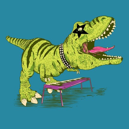 T-Rex is rocking out on this super cool dino tee. A fearless T-rex plays keyboard and wears kiss make up in T-Rockers! A funny character based tee this dino will roar the loudest from inside your wardrobe. Wear the T-Rocker tee and show people your sense of humour and your love for music.