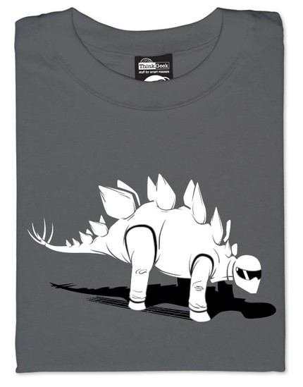 A stegosaurus in The Stig's iconic white uniform and helmet graces the front of this charcoal grey, 100% cotton t-shirt. Oh, and also? Tire tracks.