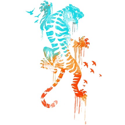 Paint drips down the tigers back as he rises up your shirt. This drippy painted symbol of strength is a refreshing take on a big cat tee. The Tiger climbs and paint runs to make a unique and cool art piece. It's tiger time for all lovers of fashion and cats.