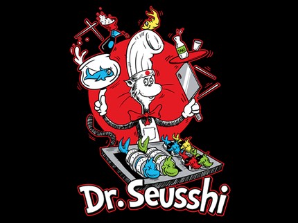 A red fish, a blue fish, they're all sushi to me, I am a cat you see. For just a few bucks you can own this tee. Order One, Two, Three, and the Fourth tee is FREE!