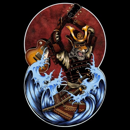 A Samurai Warrior with awesome guitar skills goes punk! This Samurai tee shows a cool warrior about to smash his guitar as the sun rises and waves crash. This cool tiger tee is well drawn and has cool iconic images within. Let your inner tiger rock with this cool music themed tee.